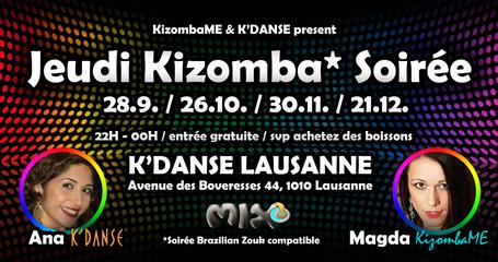 Ne manquez pas nos 4 soirées KIZOMBA (les jeudis 28.09 - 26.10 - 30.11 et 21.12) dans la grande salle de Lausanne avec Magda (KizombaME) et Ana (K'Danse)